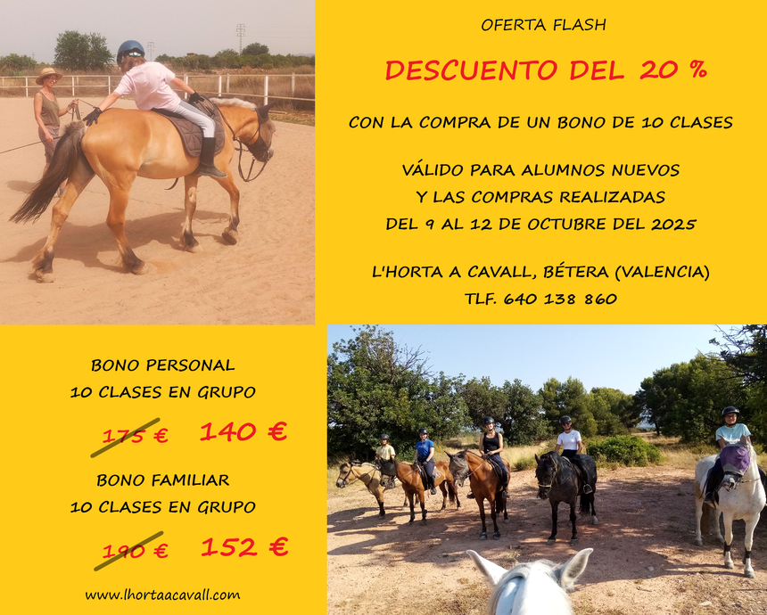Este año ponemos a su disposición un descuento especial para los que traigan a sus amigos al Centro Ecuestre L'Horta a Cavall: